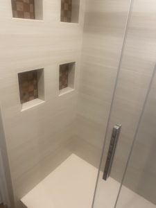 Salle de douche composée d’un receveur de douche Syan, paroi de douche Rothalux, meuble Stocco, armoire de toilette Keuco, colonne de douche Valentin et robinetterie de vasque Grohe.